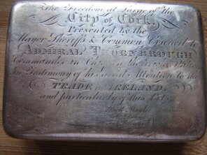 Irish Provincial Silver Freedom Box of round oblong form, with applied Cork Coat of Arms on the lid, the border engraved with ribbon of acorns, oak leaves and roundels. The base inscribed 'The Freedom at large of the City of Cork presented by the Major, Sheriff and Common Council to Admiral Thornborough, Commander in Chief in the Irish station, in testimony of his great attention to the trade of Ireland & particularly of this city, Paul Maylor, Mayor, Rob Deane & Jonathan Bernard, Sheriffs, & W Jones, T Clerk.' by Kean Mahony of Cork, Dublin hallmarks for 1808.