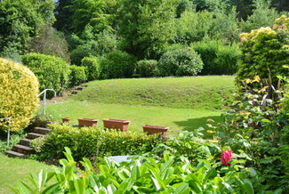 Garden lad out with grass lawn and a profusion of shrubs and roses..