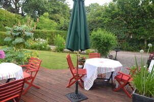 Mature hedged in garden with southerly aspect laid out in grass lawn having a profusion of shrubbery, flowers and roses. Raised Deck area with steps to garden. Security lighting.