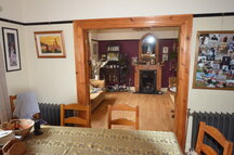 Dining area with cast iron fireplace with marble hearth and gas fire inset, double doors to deck.