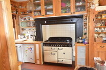 Rustic Kitchen having Rangemaster gas stove in alcove with extractor fan, pine countertops, wall and floor presses, numerous powerpoints, old Belfast sink inset in granite counter with Victorian brass tap, presses and drawers under. Door to rear garden.