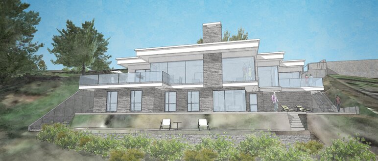 The residence is approached by a stone flagged patio with raised balustrade having urn topped portals to steps.