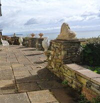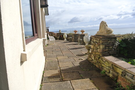 To Front: Stone flagged patio with raised stoneworked walls, lower crazy paved terrace with lounge area.