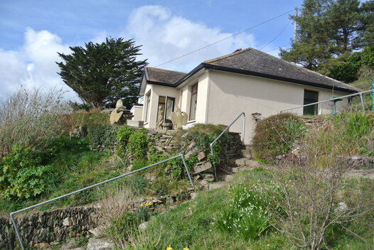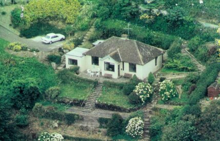 At side: Sloping tarmacadamed driveway and parking area. Separate pedestrian entrance.