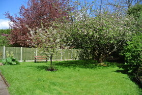 Garden laid out in grass lawn with a profusion of mature trees and shrubbery.