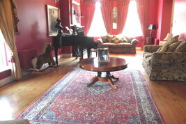 This big room’s floored in oak, has two access points, and four arched or domed windows on three sides, richly swagged and draped. This great room is graced by a black baby grand piano, and could as easily take the full sized instrument, or even fit in a Deauville-style chamber orchestra — who’s soiree now?