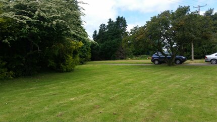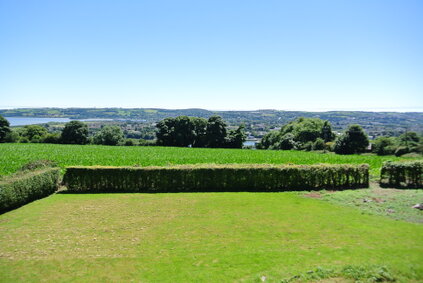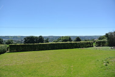 The large elevated garden is laid out in grass lawn with mature hedge borders, a profusion of shrubbery and trees.