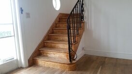 Stairs with wrought iron bannister. Long hall with timber floor. Hotpress with shelving.