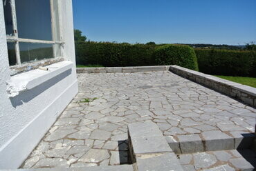 There is a raised stone flagged terrace with dwarf walls having full southerly aspect and panoramic views over the surrounding countryside, downriver and over to Beaumont and west over the City.